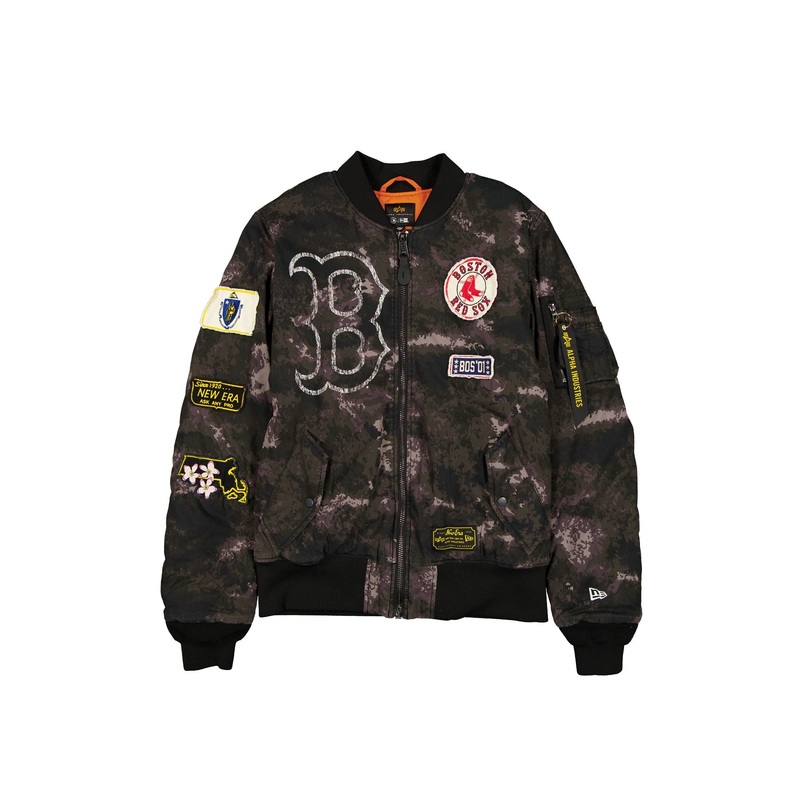 The Alpha Industries x Boston Red Sox Black Camo MA-1 Bomber Jacket features a screen-printed Red Sox logo at the right chest with a matching team graphic at the rear, a full-zip closure at the front, and a woven x Alpha Industries tag at the hem. Additional details include frayed edge alternate team logos at the left chest with a patch, Massachusetts state flag, and Massachusetts state flower patch at the right sleeve. Further details include the Fenway Park ballpark blueprint at the interior lining.