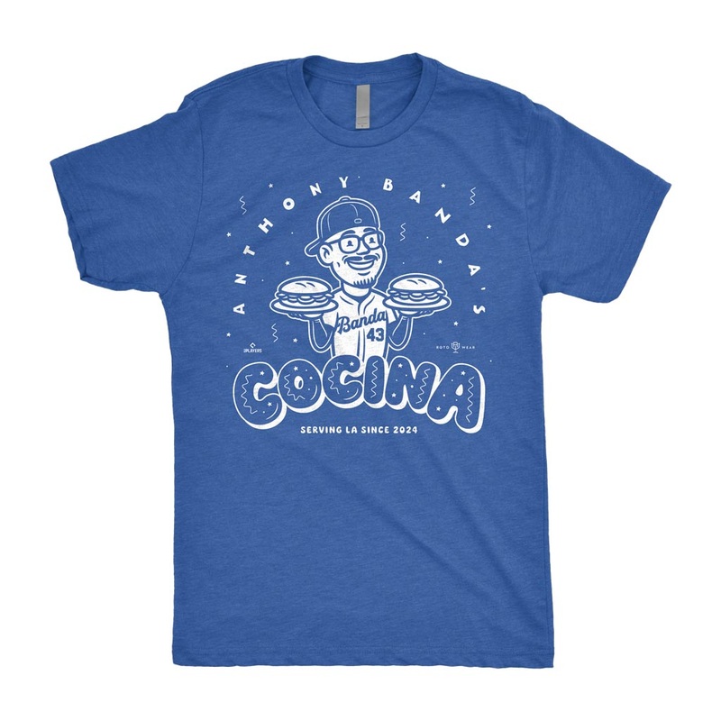 Anthony Bandas Cocina serves the best latin cuisine in LA!Premium athletic fit t-shirtRing-spun cotton / polyester blendScreen-printed in the USAAvailable in RoyalThis is an officially licensed product of the Major League Baseball Players Association.