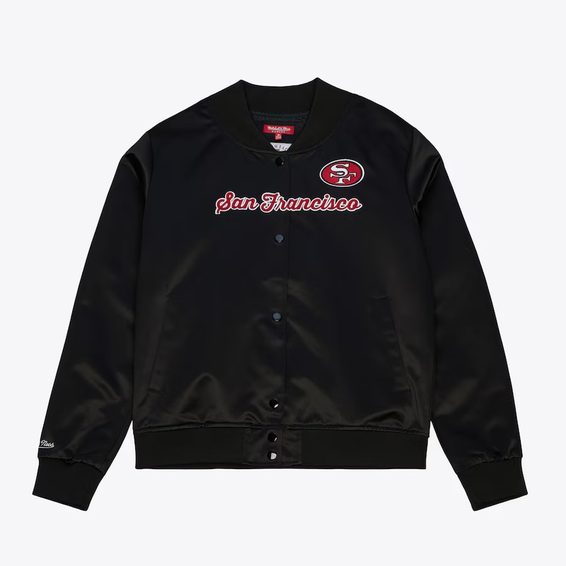Rep your San Francisco 49ers in a retro-inspired way with this full-snap jacket. Crafted with satin fabric provides a sleek, high-shine look, its a fashionable statement piece. Embroidered San Francisco 49ers graphics on the front and back showcase your team pride in style.
