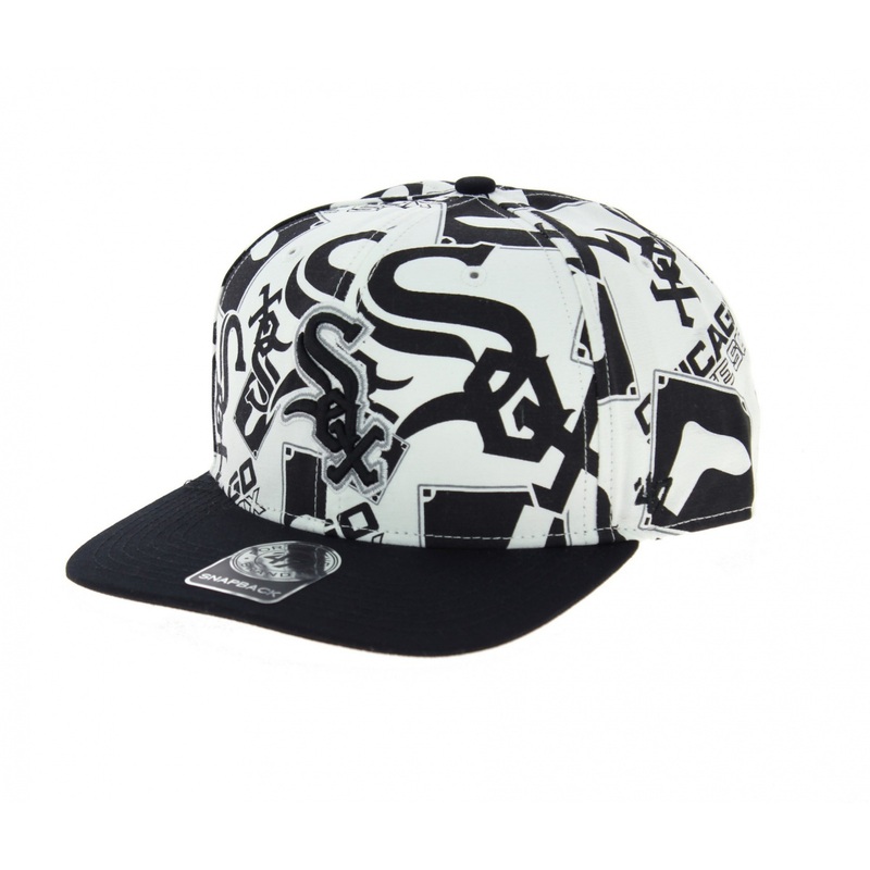 Casquette snapback Chicago White Sox noire et blanche, par 47 Brand. Casquette Chicago White Sox- 47 Brand Casquette noire avec logo quipe Sox rod sur l'avant et autocollant officiel sur la visire pour les fans. Dtails : coloris blanc avec motifs et visire